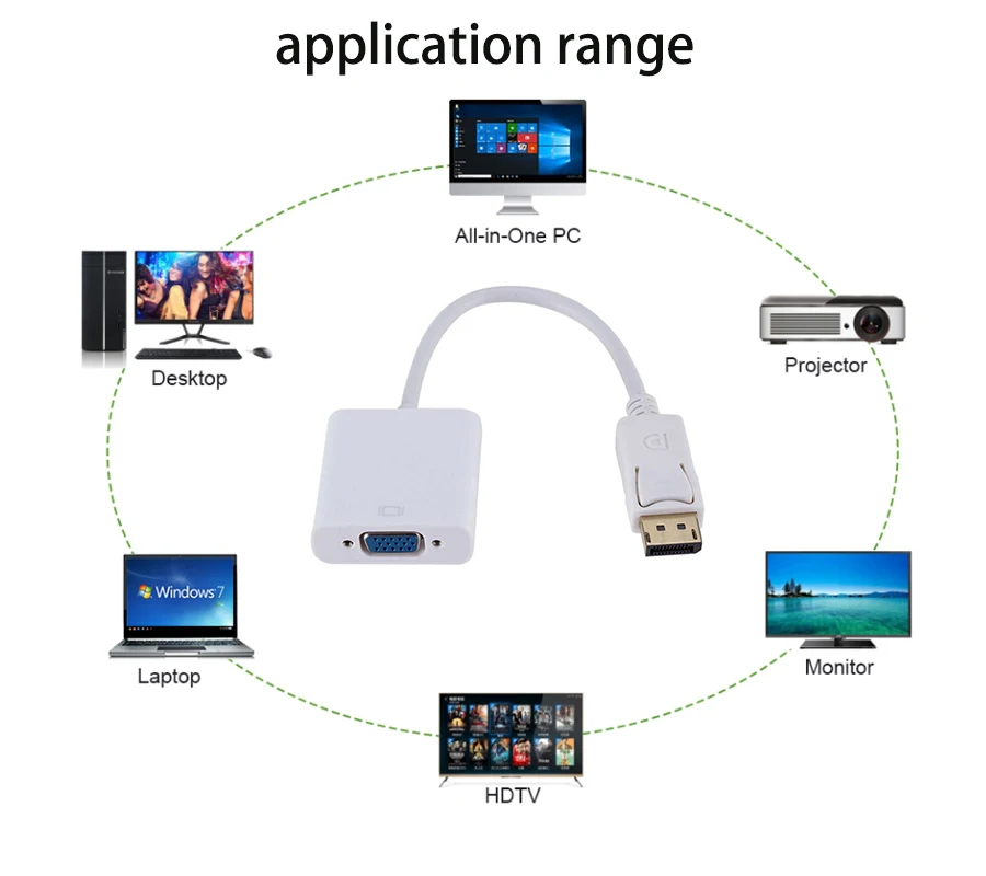 Scope of application: Suitable for computer TVs or projectors with DP interfaces connected to input devices with VGA ports. DisplayPort supporters include display devices from Dell, HP, Lenovo, Philips, ATi, nVIDIA and Samsung.