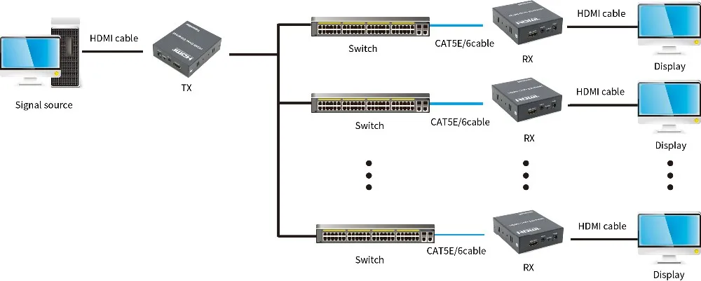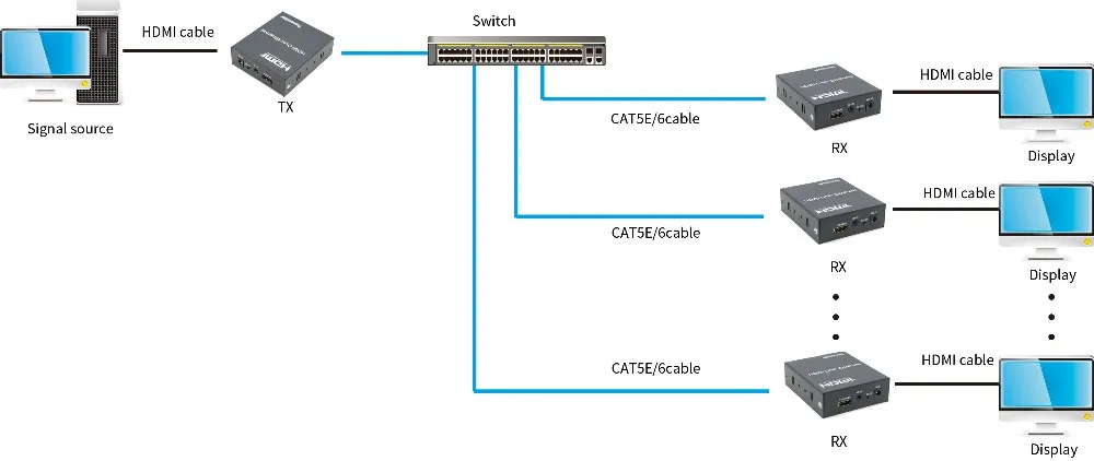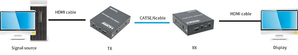Transmits HDMI video and audio signals up to 120m over a single CAT6 cable